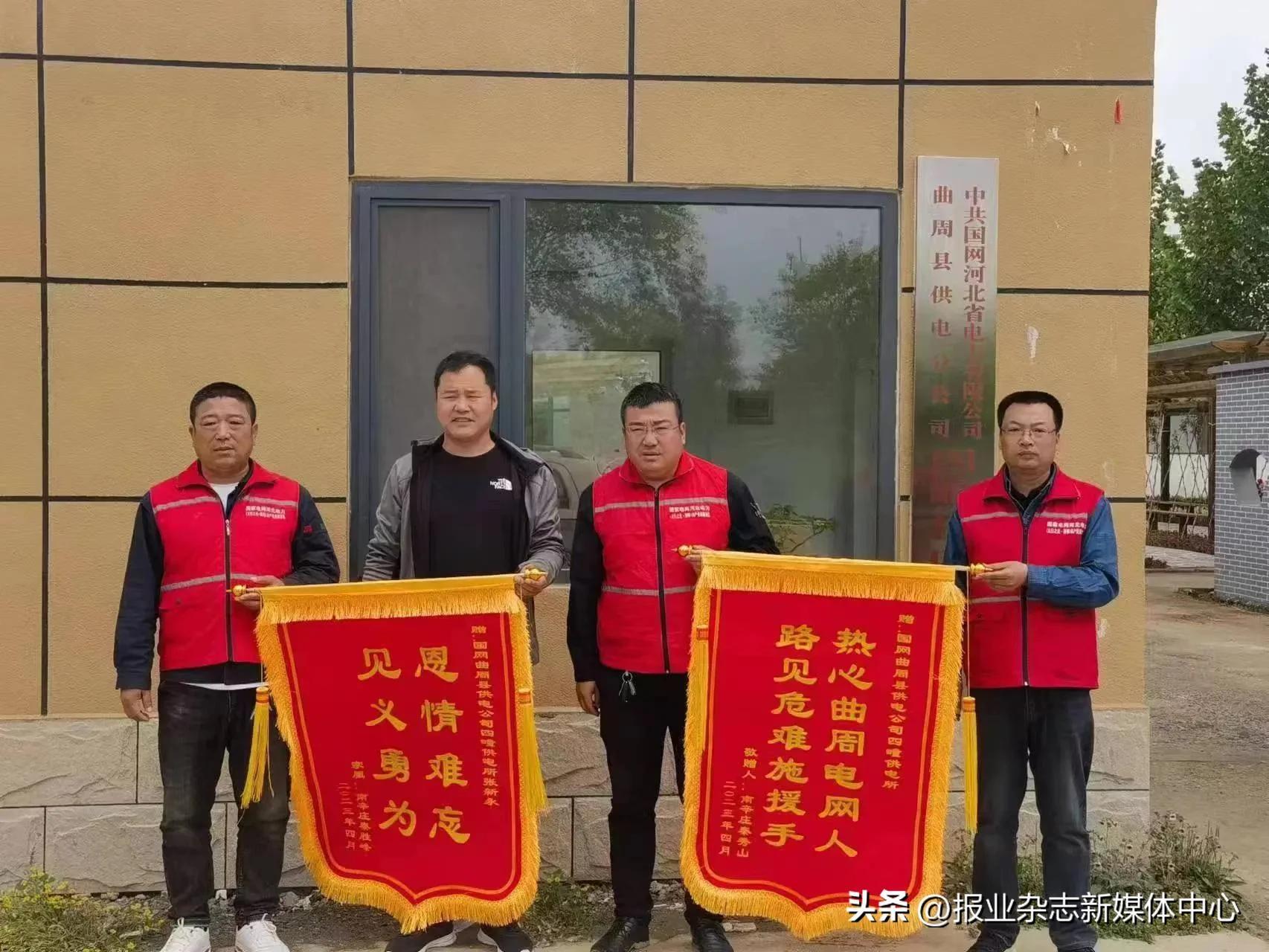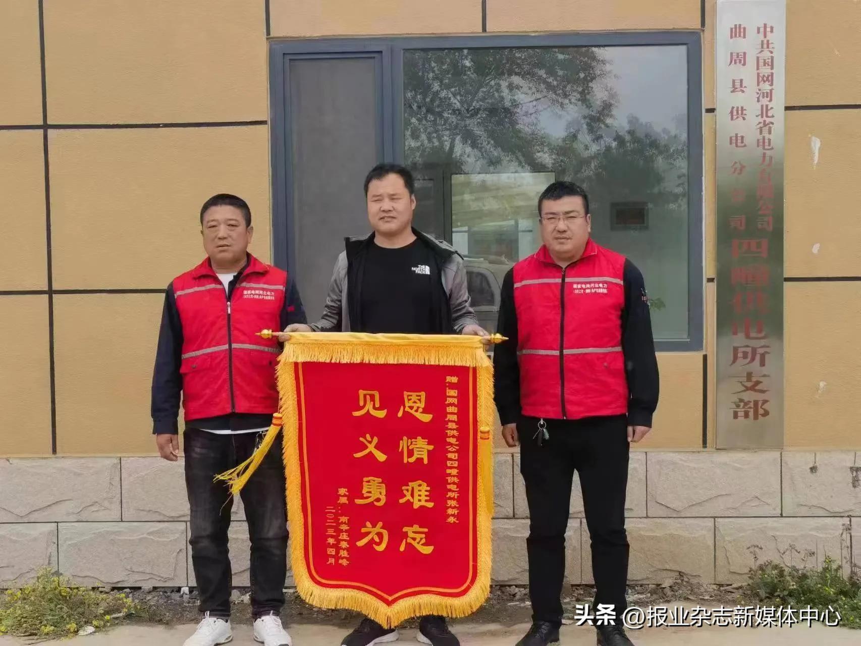 2023年5月5日上午11时,南辛庄村民秦胜峰带着两面印有“路见危难施援手,热心曲周电网人”以及“见义勇为,恩情难忘”的锦旗来到四町供电所,感谢北辛庄台区经理张新永在危难时刻勇于救人的善举。