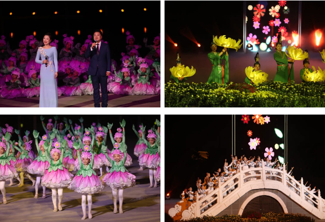 “菊花花儿黄,菊花花儿香……”一段清澈童谣轻轻穿过夜色,开场演出的歌声忽远忽近,乐声中,渐渐地,菊花一瓣瓣、一朵朵朦胧绽放,直至开成梦境般的一整片温暖花海……接下来各个演出依次揭开神秘面纱,如鲜花般绚丽,如梦境般璀璨。