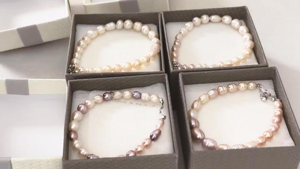 游客自行挑选的珍珠蚌,加工成手链不超过百元。在姬庄村的珍珠加工厂内,姬海涛指着正在打包的一串手链,介绍道:“这就是客户自己挑选的蚌,一个60多块钱,开出来的珍珠颜色、大小可能不等,但加上加工费,不超过100块钱就能拥有一条货真价实的珍珠项链或者手链。”