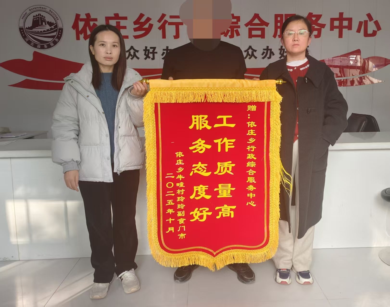 2025年10月27日下午,曲周县依庄乡综合服务中心出现暖心一幕:我乡牛疃村玲玲副食门市负责人将一面写有“工作质量高,服务态度好”字样的锦旗,亲手送到了服务中心工作人员手中,以此表达对中心工作人员耐心周到、高效便捷服务的诚挚感谢。